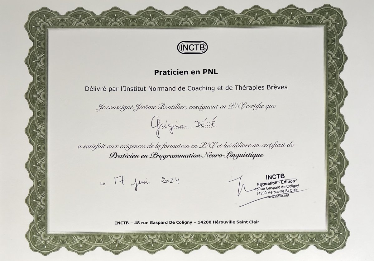 En 2023, j'ai suivi la formation de praticien en hypnose Ericksonienne et PNL à l'Institut Normand de Coaching et de Thérapies Brèves.
